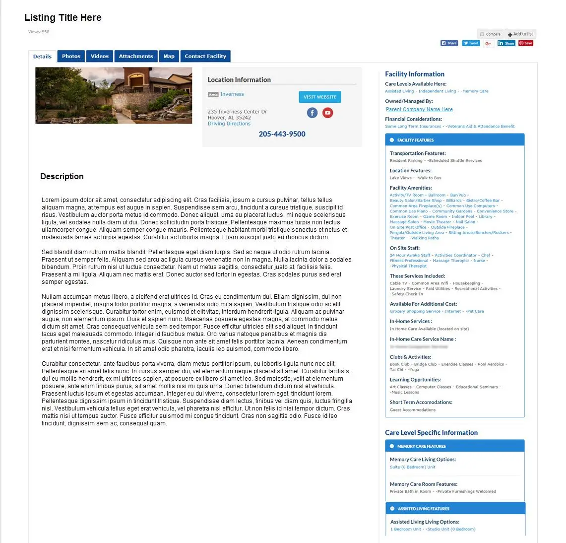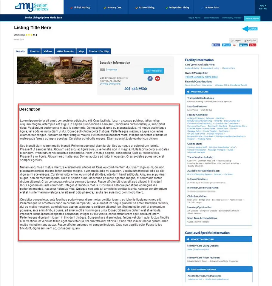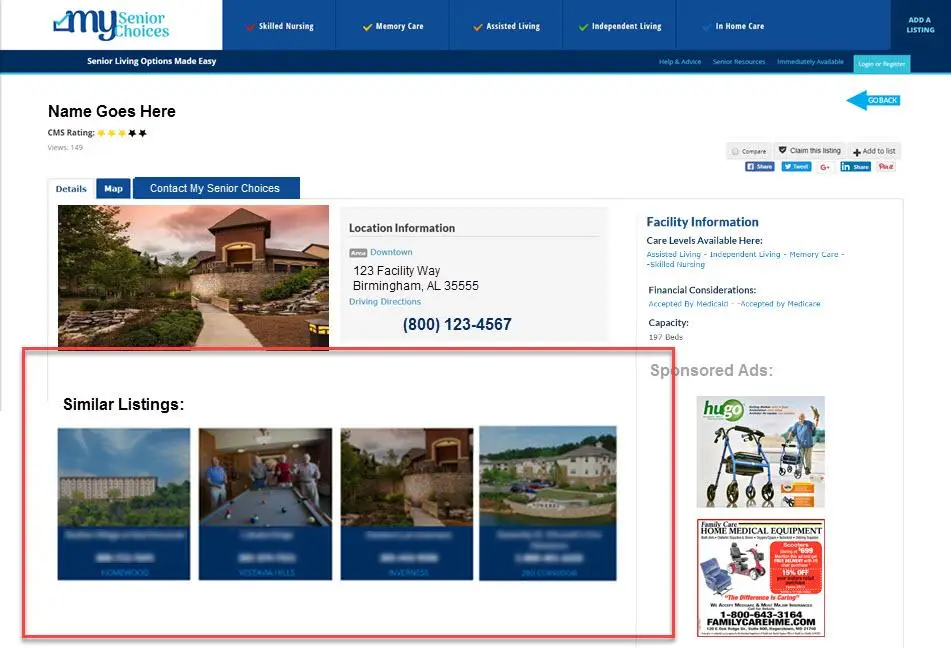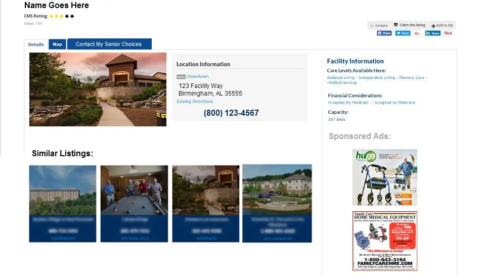 | BASIC INFO (TITLE, CMS RATING [IF SKILLED NURSING FACILITY], PAGE VIEWS, COMPARE, ADD TO LIST, SOCIAL SHARE BUTTONS) | Preview | ||